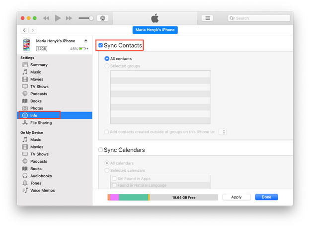 Firstly you will have to make sure that you have installed the latest version of iTunes on your Mac or PC. After opening iTunes, you will need to plug your old iPhone into your computer. In iTunes, a popup message will appear showing your old iPhone. Select your phone and click Info on the left sidebar. Tick the Sync Contacts > Apply. After the sync is complete, you will need to unplug the old iPhone and plug in the new iPhone with your computer. Again choose the new iPhone in iTunes and then select Info on the left sidebar. You have to ensure that the Sync Contacts have been ticked. Scroll down to the Advanced menu and tick the Contacts option. Finally, click Apply to sync the contacts to the new iPhone.